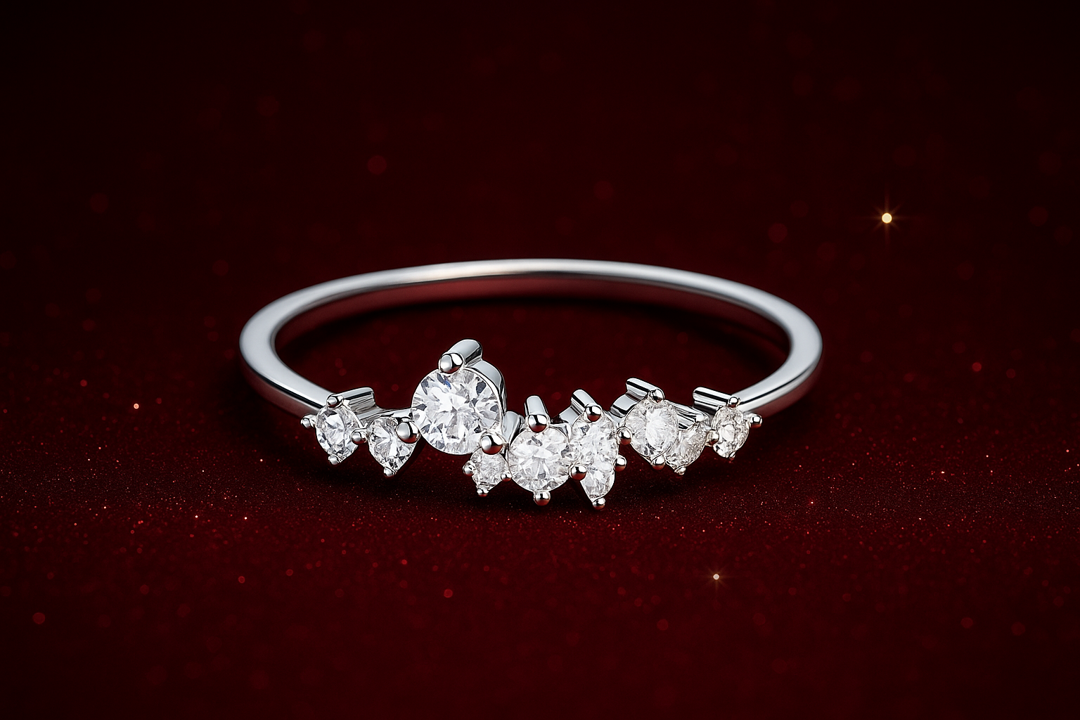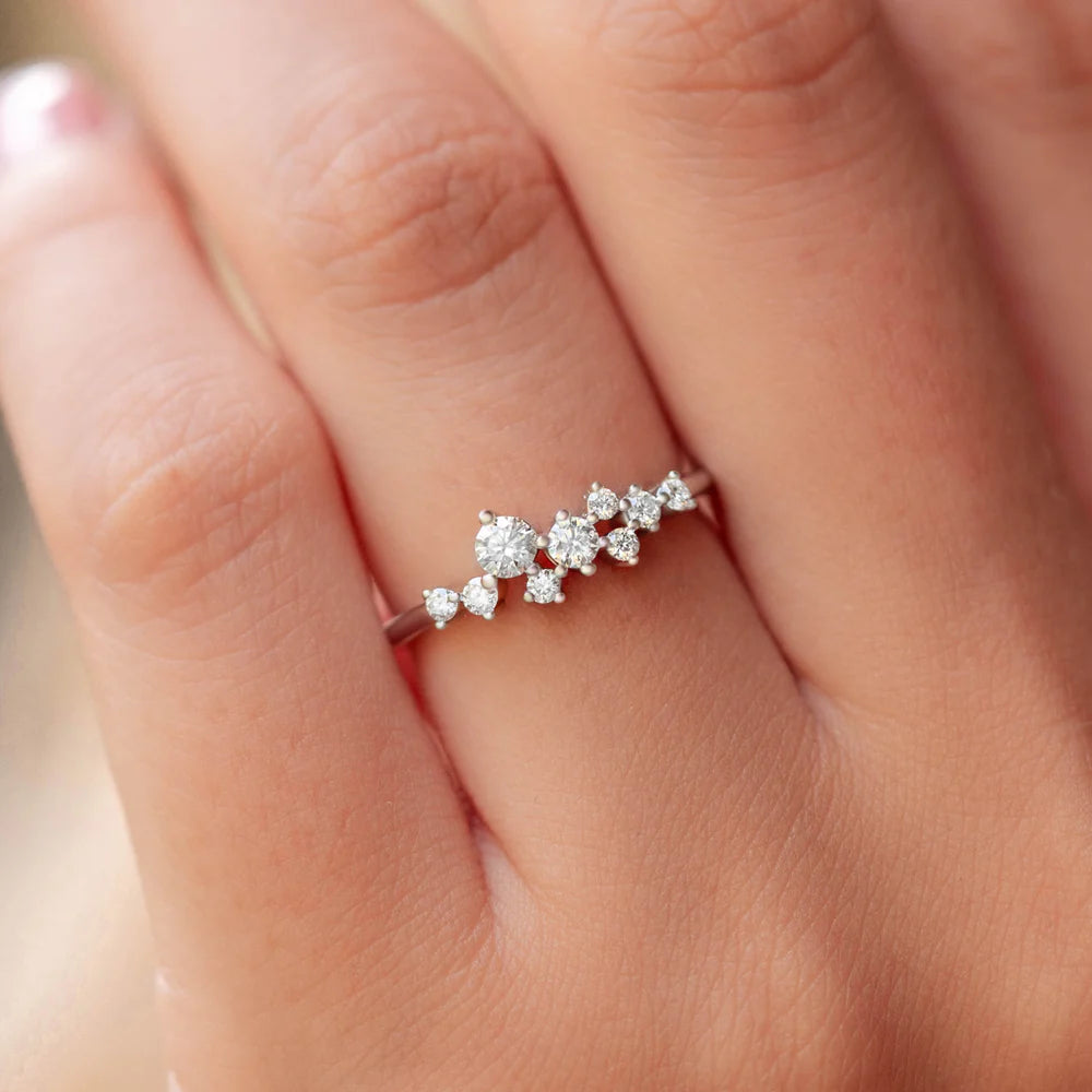 The Cascade is a blend of classic elegance with modern charm. Crafted from premium S925 sterling silver, this ring showcases round-cut moissanite stones in a scattered stone prong setting, creating a dazzling brilliance.