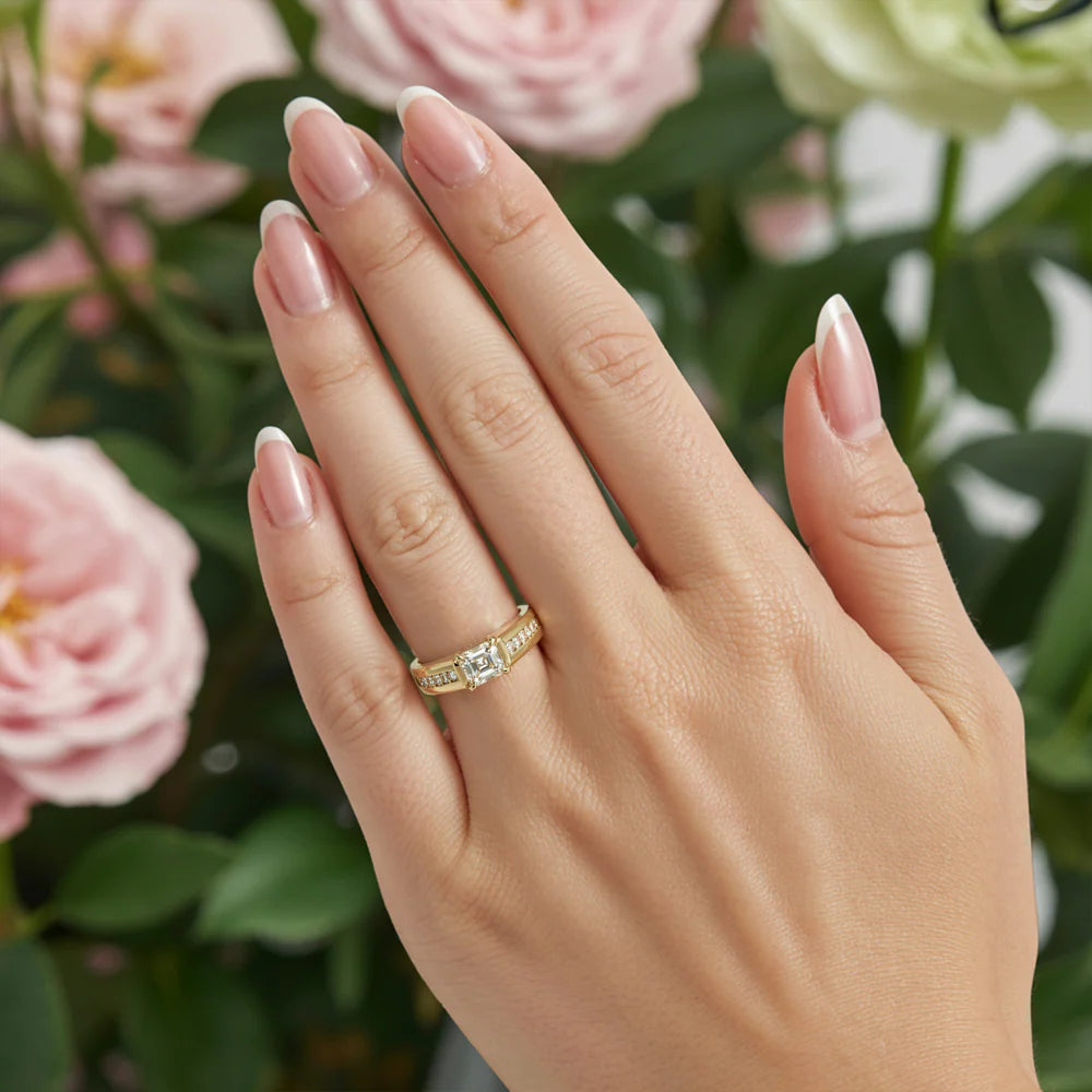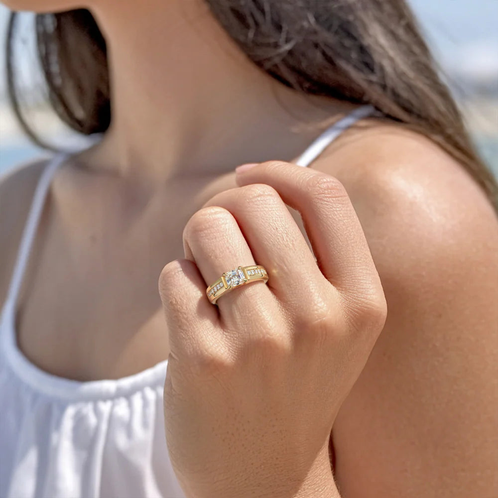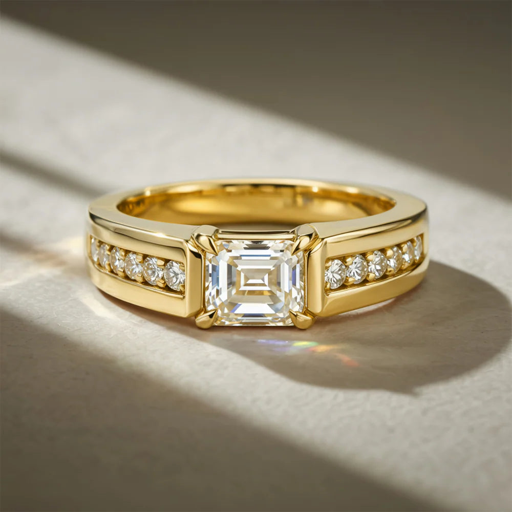 Discover The Elara, where modern sophistication meets timeless sparkle. This ring showcases a captivating emerald cut moissanite set horizontally, offering a fresh perspective on a classic design.