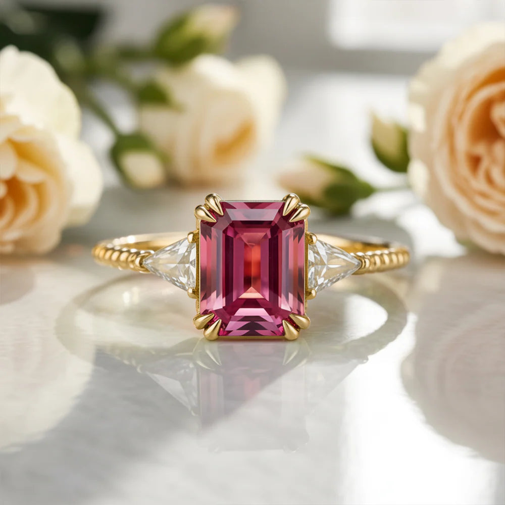 The Liora reimagines tradition with a geometric twist. At its heart lies a 2CT red emerald cut moissanite—flanked by two trillion-cut white moissanites that sharpen its silhouette. The sculpted braided band adds tactile charm and depth, crafted in rich 18K yellow gold vermeil. Designed for those who love a balance of bold color and timeless clarity, this ring speaks volumes without saying a word.