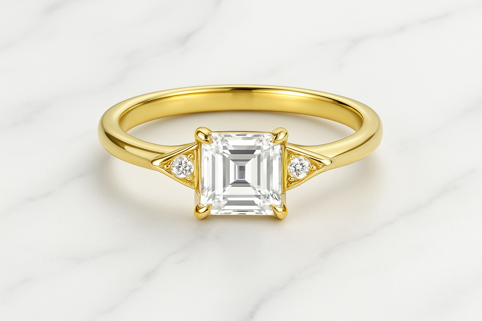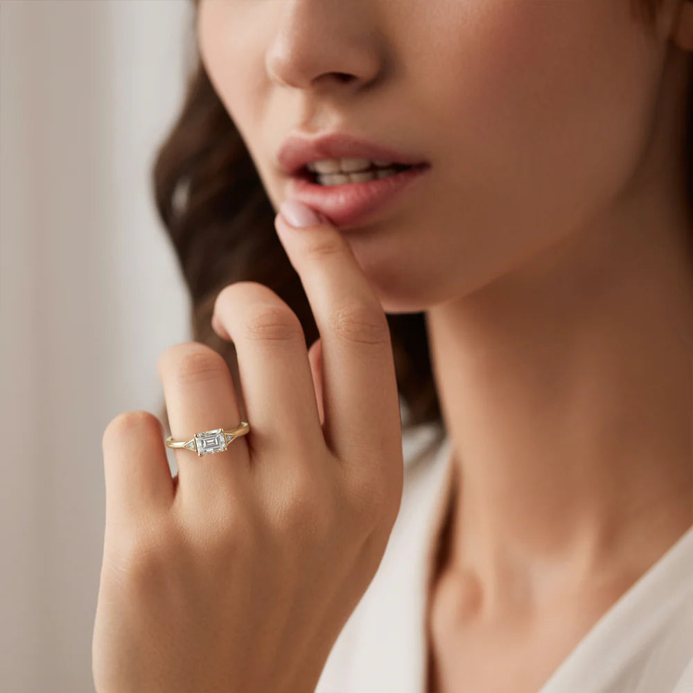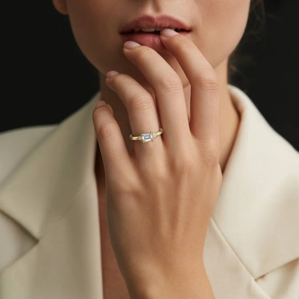 The Lyra redefines modern elegance with its distinctive east-west emerald cut moissanite, a design that commands attention and admiration.