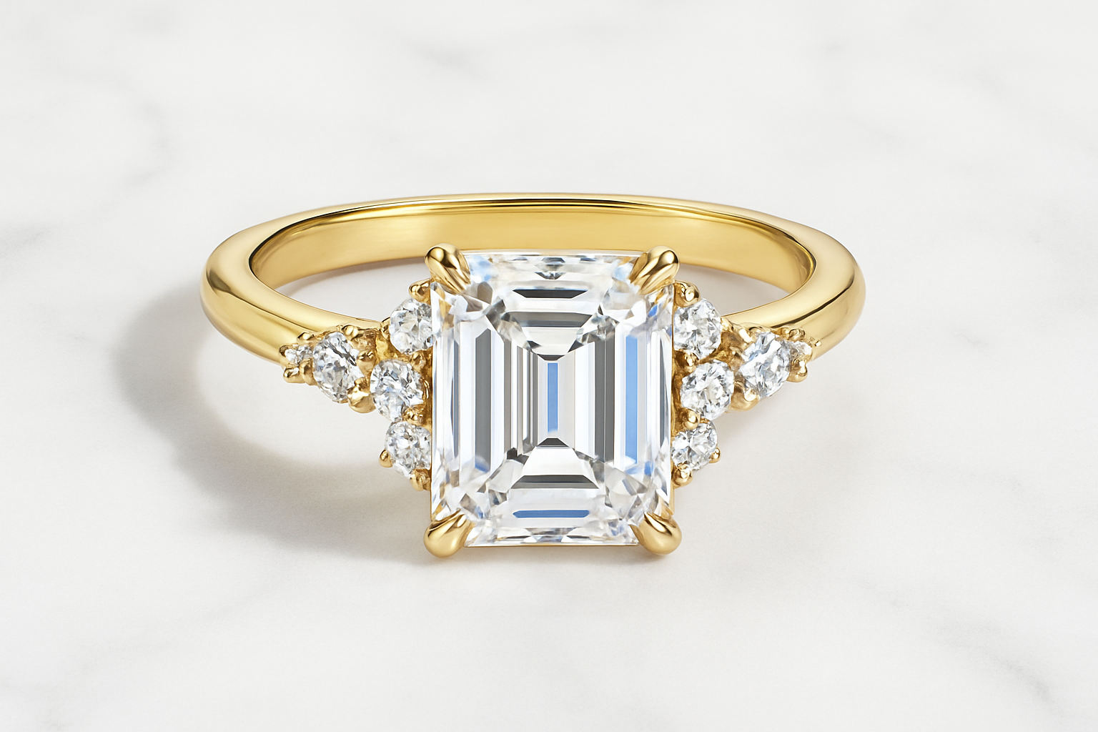 - Stunning 1CT emerald-cut flawless moissanite centerpiece